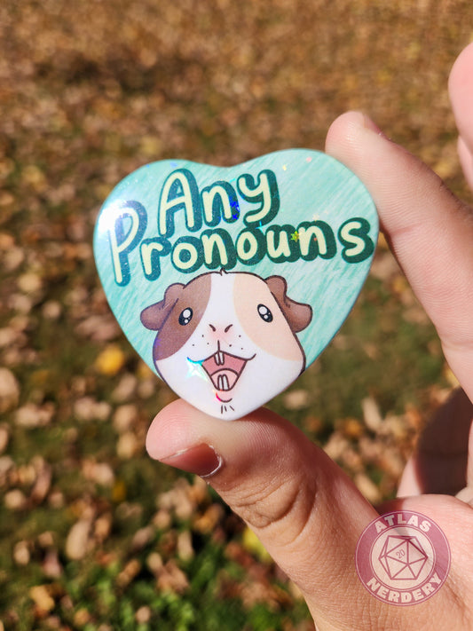 Any Pronouns - Alucard the Guinea Pig Pronoun Button - 2.25” x 2” Holographic Heart Shaped Pinback Button