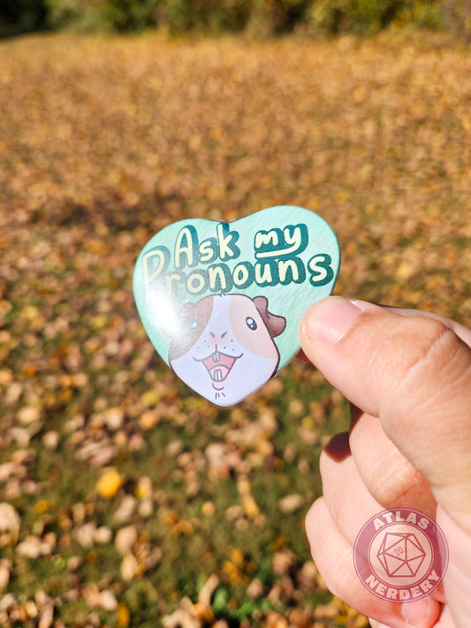 Ask My Pronouns - Alucard the Guinea Pig Pronoun Button - 2.25” x 2” Holographic Heart Shaped Pinback Button