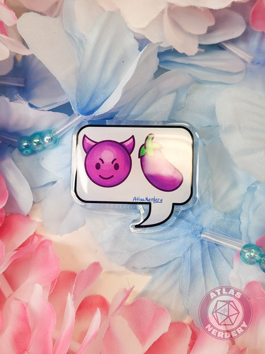 Smiling Devil Eggplant Emojis - 2" Acrylic Pin with Epoxy Dome Coating